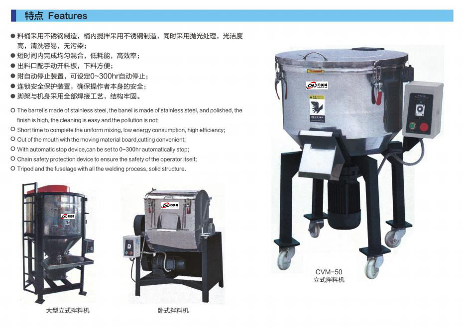料桶采用不銹鋼制造,桶內(nèi)攪拌采用不銹鋼制造,同時采用拋光處理,光潔度高,清洗容易,無污染; 短時間內(nèi)完成均勻混合,低耗能,高效率;出料口配手動開料板,下料方便;